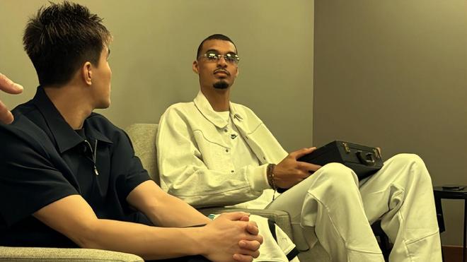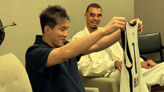 來而不往非禮也,文班亞馬也回贈了郭艾倫一件他在馬刺隊所穿的一號戰袍。只是那件球衣穿到郭艾倫身上有點像袍子,倒也挺好玩的。