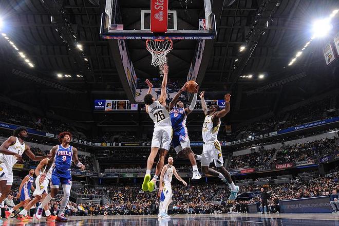 76人上一場客場135-108大勝森林狼結束4連敗,步行者過去3場遭遇3連敗,本賽季前兩次交鋒76人均主場戰勝步行者。本場76人缺少喬治,步行者缺少哈利伯頓、西亞卡姆、祖巴茨與內史密斯等。首節開局76人4-8落后,在首節中段繼續14-18落后4分,恩比德率隊追到21-21。步行者一波13-5攻勢取得領先,76人持續被壓制落后,首節結束76人30-38落后步行者。首節步行者25中14,其中三分11中6,瓊斯與波特均得到8分;76人21中11,其中三分8中4,馬克西7分與恩比德6+2+3