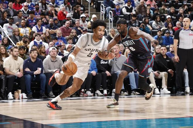 活塞過去5場收獲5連勝位列聯盟第一,馬刺過去8場豪取8連勝穩(wěn)居西部第二。本場馬刺缺少普拉姆利與加西亞,活塞缺少斯圖爾特與克林特曼。首節(jié)前3分鐘,文班亞馬外線三分開火,引領馬刺內外開花率先取得14-2領先優(yōu)勢,活塞一波7-0攻勢追分。福克斯上籃得分,活塞多點開花一波18-5攻勢反超6分,尚帕尼三分命中,首節(jié)比賽結束馬刺24-27落后活塞。首節(jié)馬刺三分11中5,文班亞馬6中2得到5+3與卡斯爾3記三分9分;活塞三分11中3,坎寧安6中1得到3+2+2與杜倫6+4。