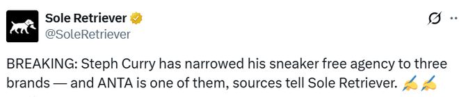 北京時間2月23日,據(jù)媒體Sole Retriever報道,斯蒂芬-庫里已將球鞋品牌候選縮小到三家,安踏就在其中。